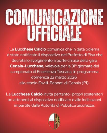Cenaia-Lucchese, in programma domenica prossima a Crespina, sarà interdetta ai tifosi di entrambe le formazioni: dopo le anticipazioni di ieri, è arrivata la comunicazione ufficiale della Prefettura di Pisa e la gara sarà a porte chiuse. E' la stessa società rossonera a confermarlo attraverso i suoi canali