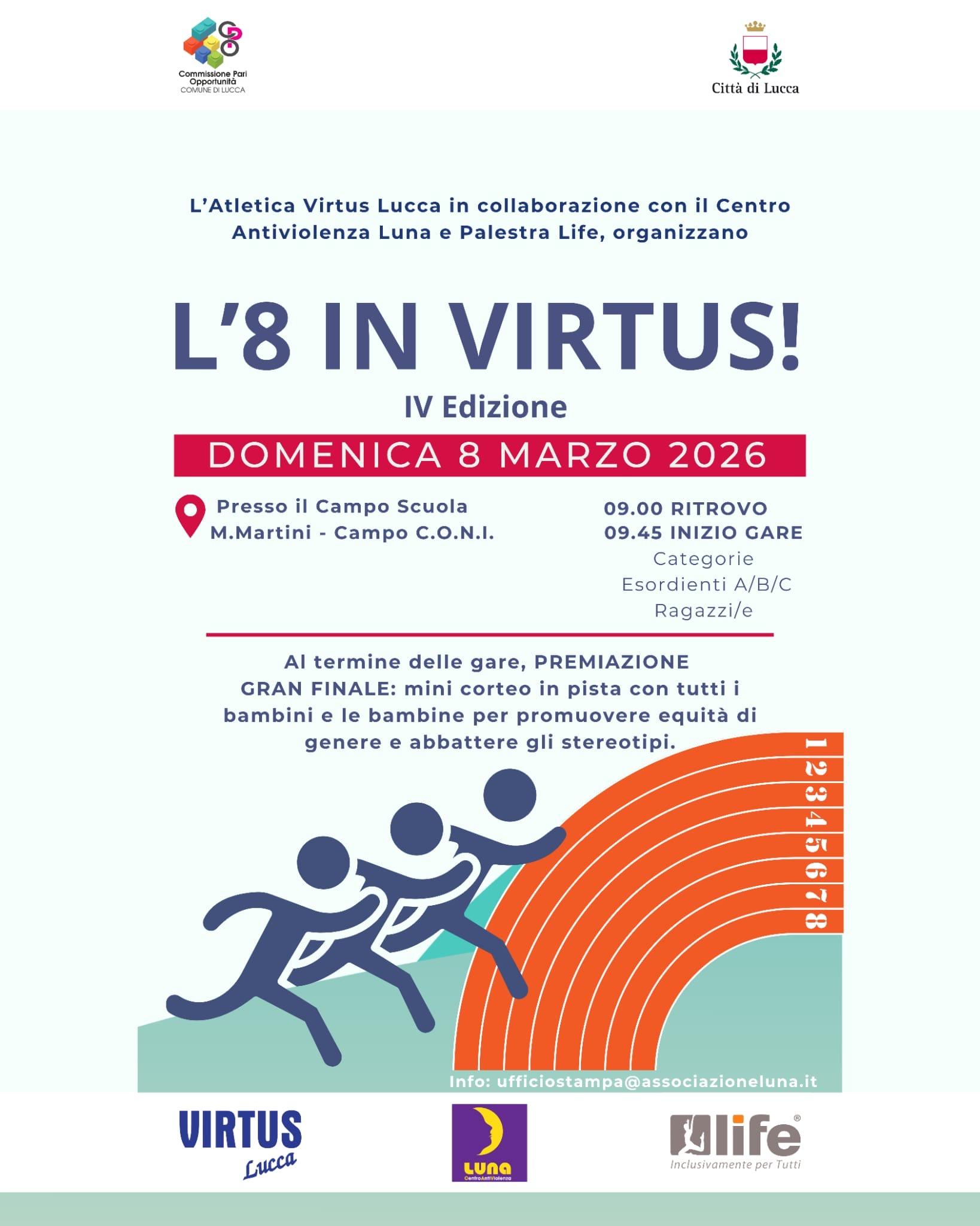 L’Atletica Virtus Lucca, da oltre cinquanta anni in pista per i giovani, per la loro crescita in un contesto sano in cui i valori e il senso del rispetto reciproco siano alla base del quotidiano, è fiera della collaborazione con due realtà come il Centro Antiviolenza Luna e Life, con le quali condivide l’idea che lo sport possa e debba essere veicolo di messaggi importanti contro ogni forma di violenza o di discriminazione. L’evento “L’8 in Virtus” racchiude la forza dell’unione di intenti e l’impegno comune per un modello di coscienza collettiva improntato sulla cultura dell’equità.