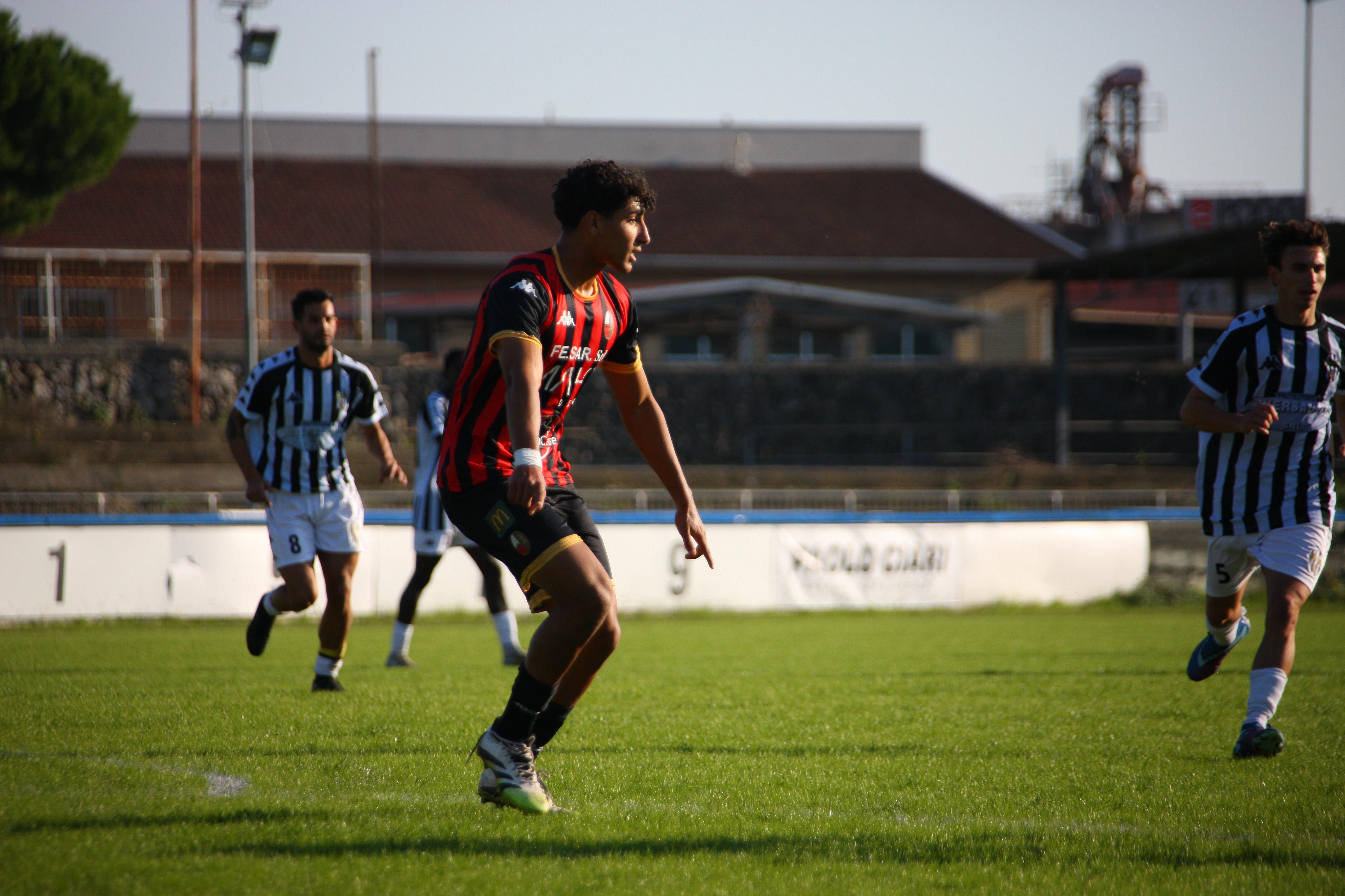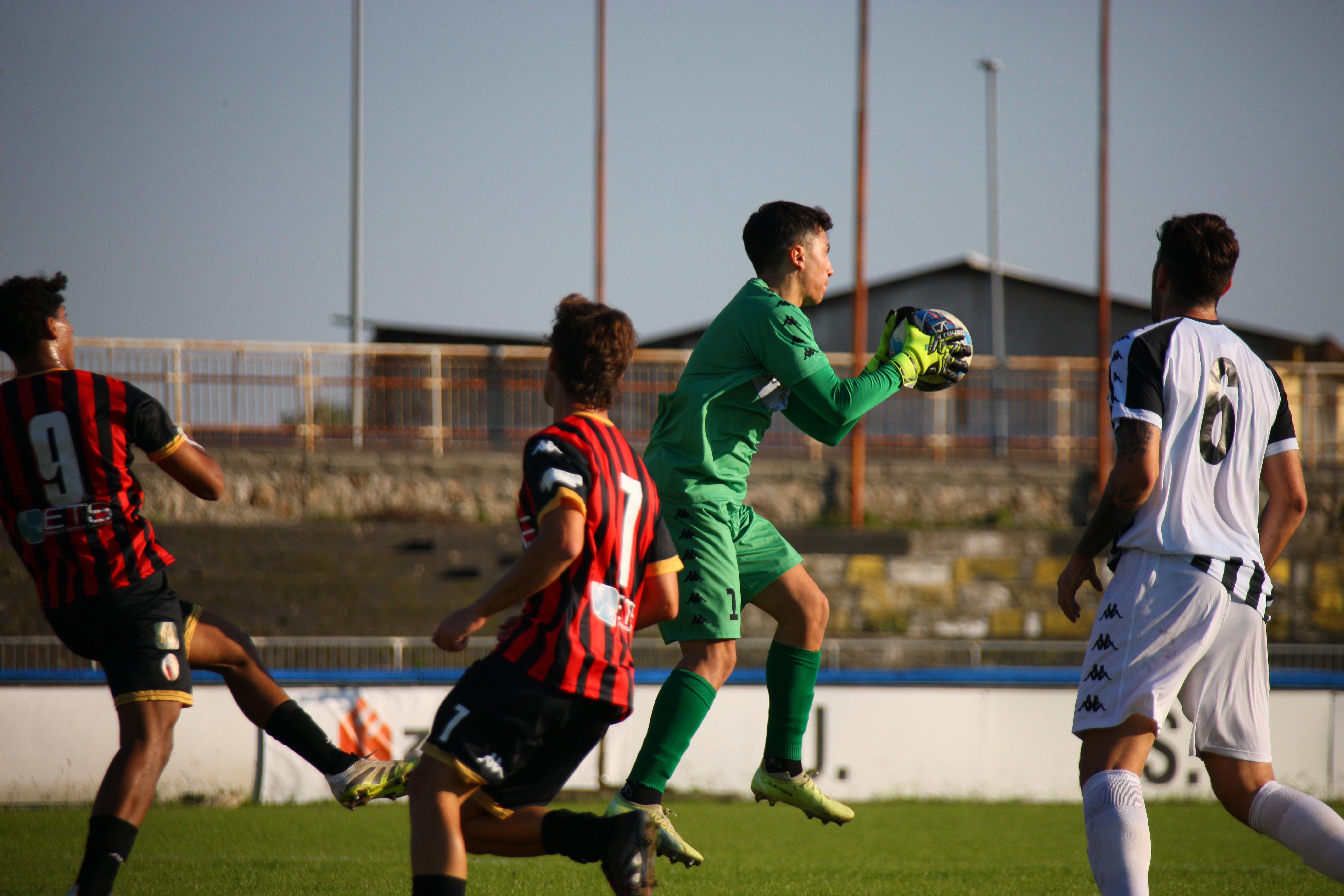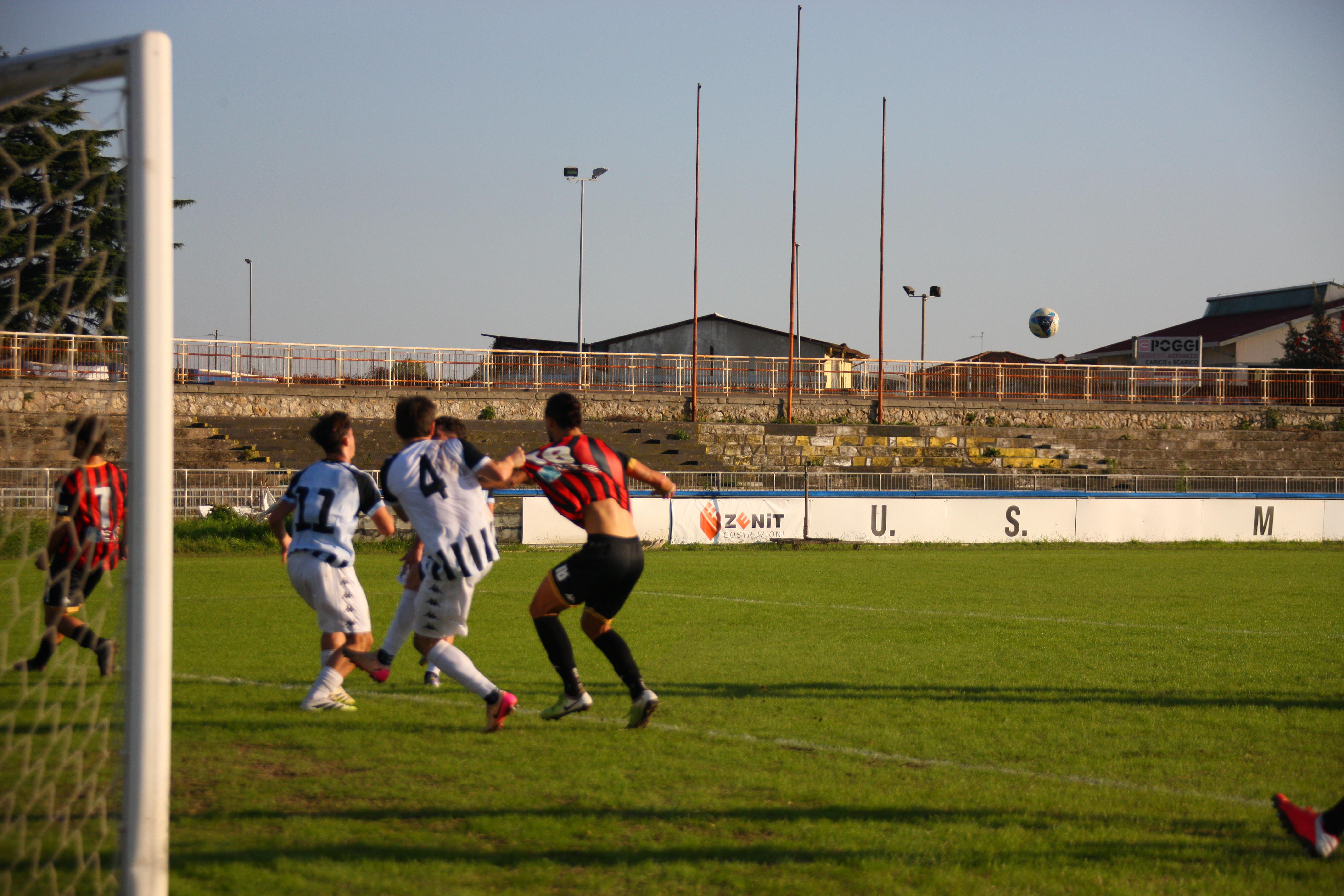 L'inizio, su un terreno solo apparentemente buono, è da ping pong, con palloni che schizzano senza un gran senso da una parte all'altra. Il primo squillo al 13': sugli sviluppi di un angolo va al tiro Picchi, la sua conclusione trova la gamba di un difensore. Cinque minuti dopo è Bartolotta a ciabattare un buon cross di Caggianese. Al 20' Piazze sul filo del fuorigioco si presenta davanti a Gatti sia pure in diagonale e si fa parare il tiro. Sugli sviluppi dell'angolo, perfetta incornata di Santeramo: è il gol del vantaggio rossonero. E' il 20'. I rossoneri insistono: al 28' Bartolotta ben servito da Riad colpisce di testa, ma la palla è alta sulla traversa. Poi è Riad a impegnare Gatti. E' un monologo, quello della squadra di mister Pirozzi. E al 44' ancora Riad chiama in causa Gatti che si supera. Per il primo tempo può bastare ed è un risultato stretto.
