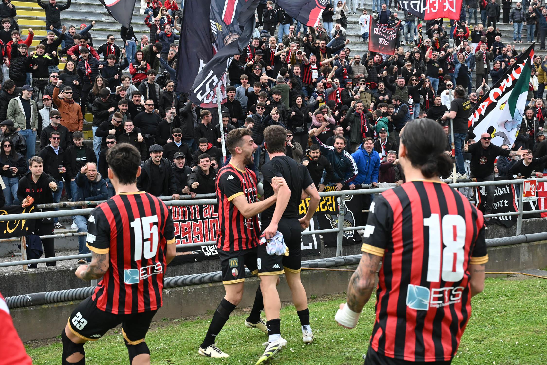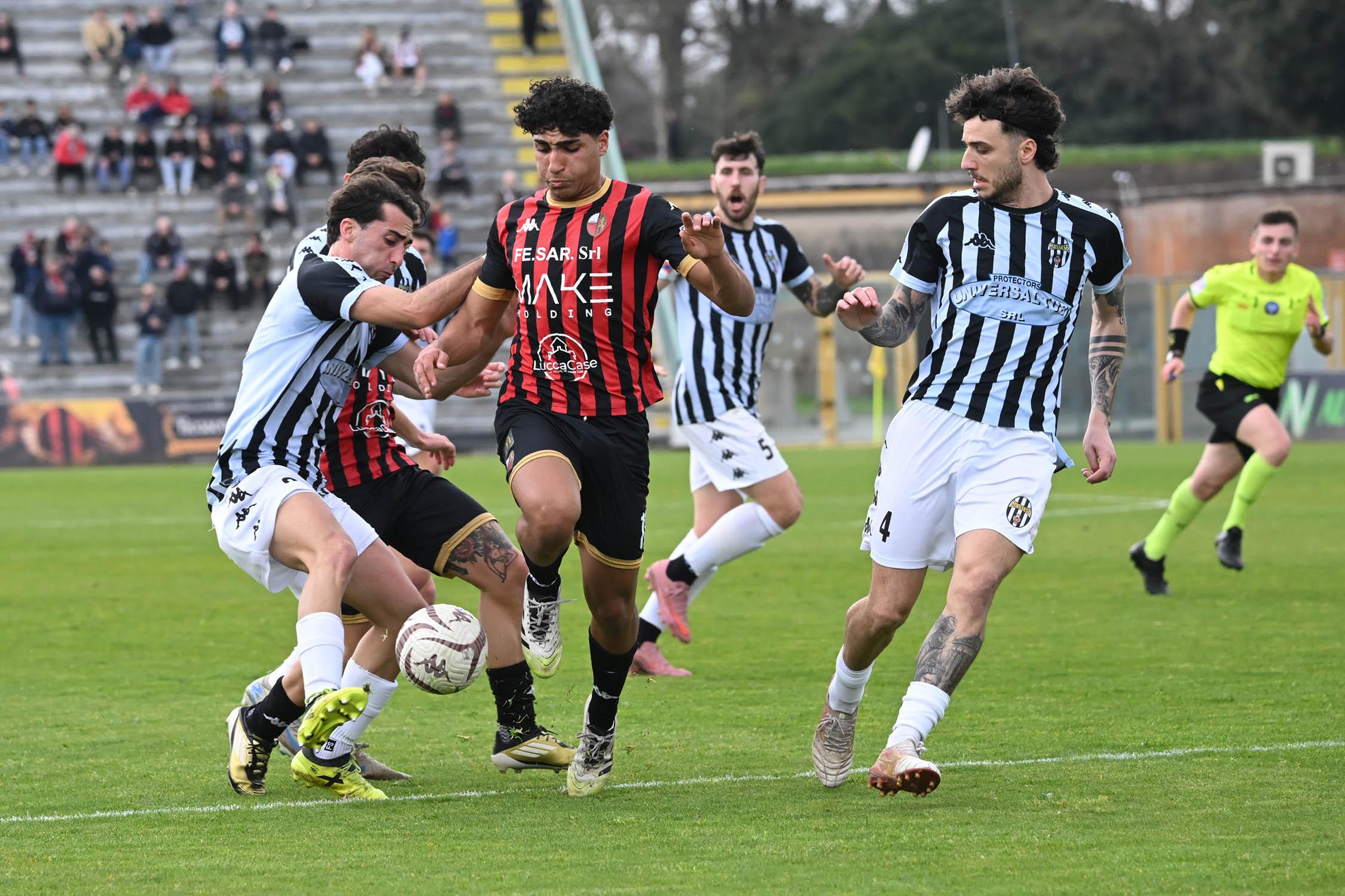 Tre punti per guardare alla Serie D, ora davvero da vicino. La Lucchese vince il derby contro una coriacea Massese che molla solo a pochi secondi dalla fine grazie a un colpo di testa di Sansaro che era entrato poco prima nel forcing disperato degli uomini di Pirozzi che cercavano a tutti i costi la vittoria. Ora, a sei giornate dalla fine, la promozione si fa più vicina.
