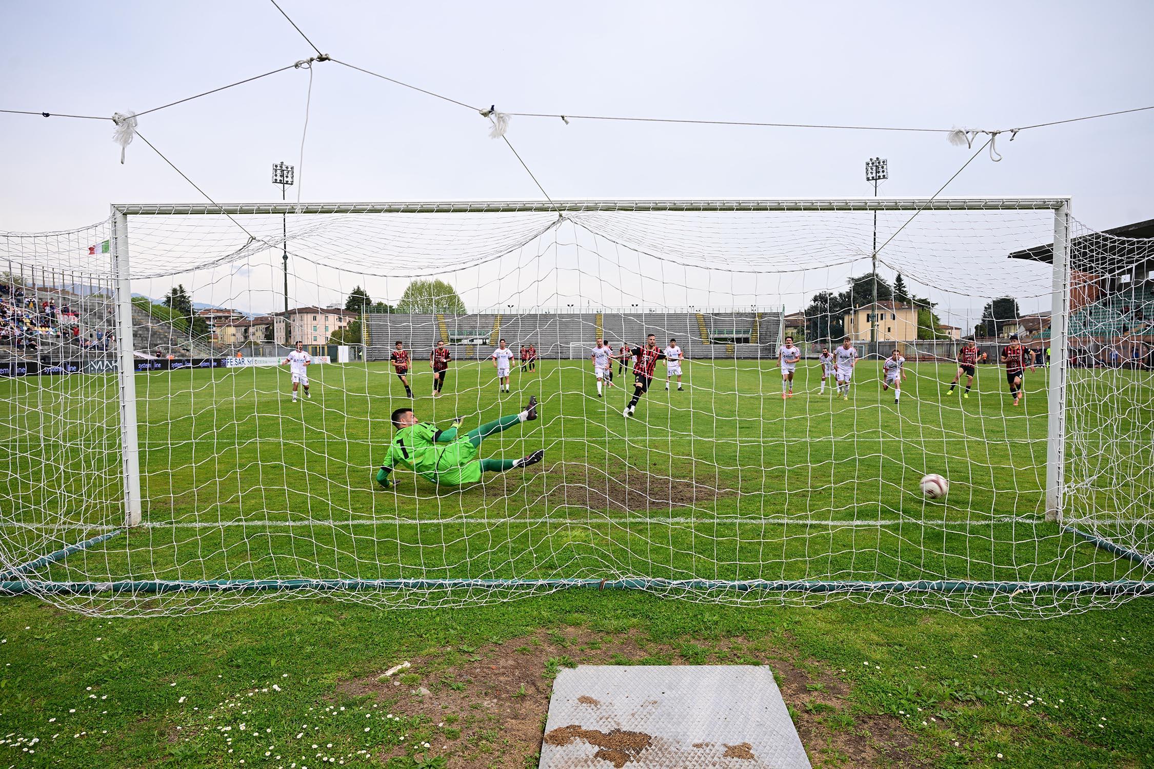 Al 21' Camilli fa tutto da solo e colpisce un clamoroso palo a Rizzato abbondantemente battuto. Non basta: otto minuti dopo sempre Camilli battezza anche l'altro palo della porta al termine di un'azione impostata da Santeramo. Il dominio è davvero assoluto, anche se dalla mezzora la Lucchese tira giusto un po' il fiato. Il vantaggio minimo all'intervallo è davvero stretto.