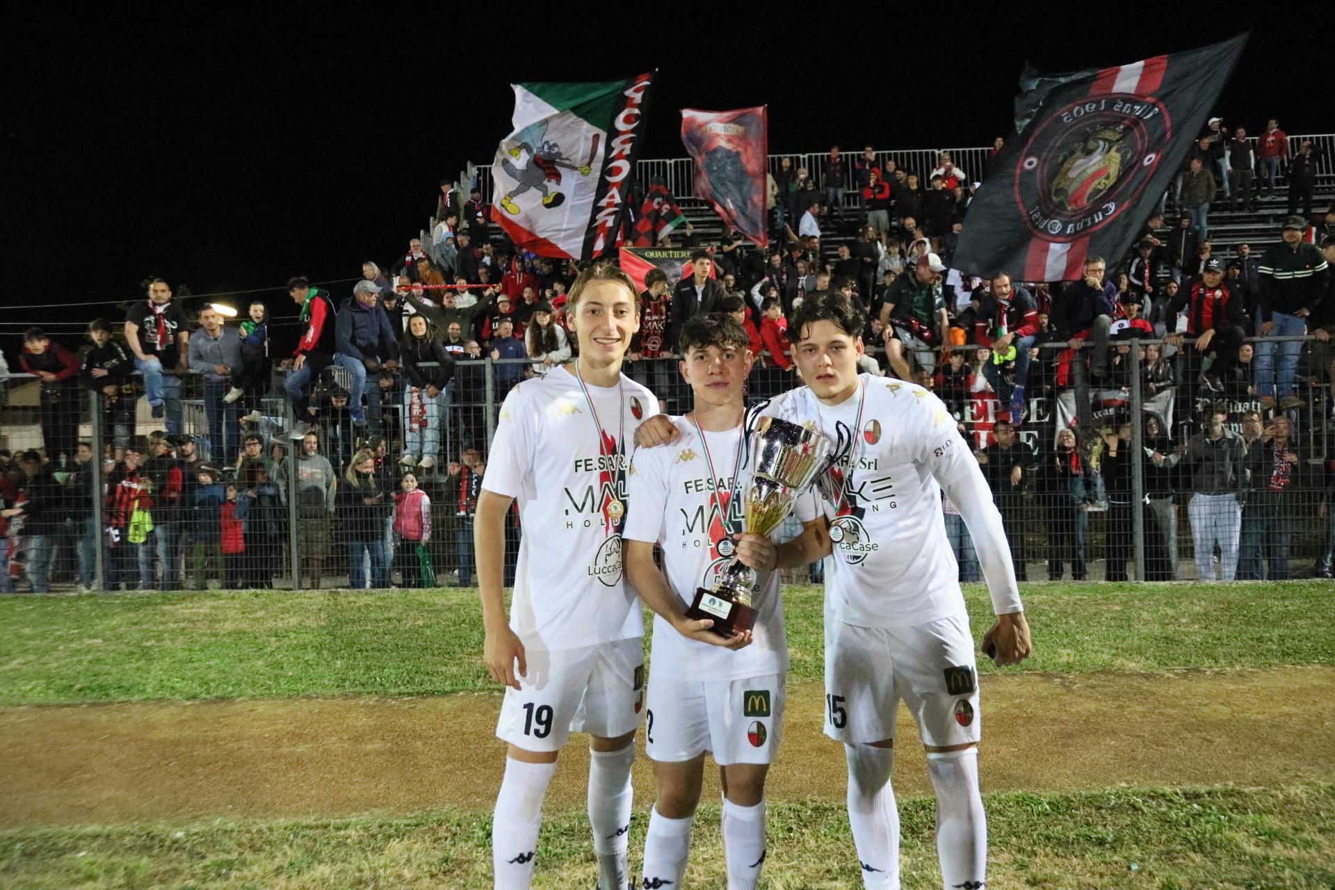 La Lucchese chiude il campionato con una netta vittoria contro il Fucecchio: Camilli e Rotondo nel primo tempo e Riad nella ripresa sigillano l'incontro. Grande festa ai rossoneri da parte del pubblico: commento, tabellino e foto