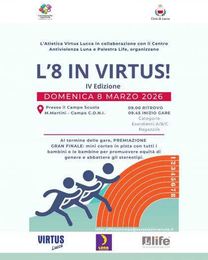 Domenica 8 marzo torna “L’8 in Virtus”, l’appuntamento sportivo promosso e organizzato da Atletica Virtus Lucca in collaborazione con il Centro Antiviolenza Luna e la Palestra Life, giunto quest’anno alla sua IV edizione: una manifestazione che unisce sport e impegno civile