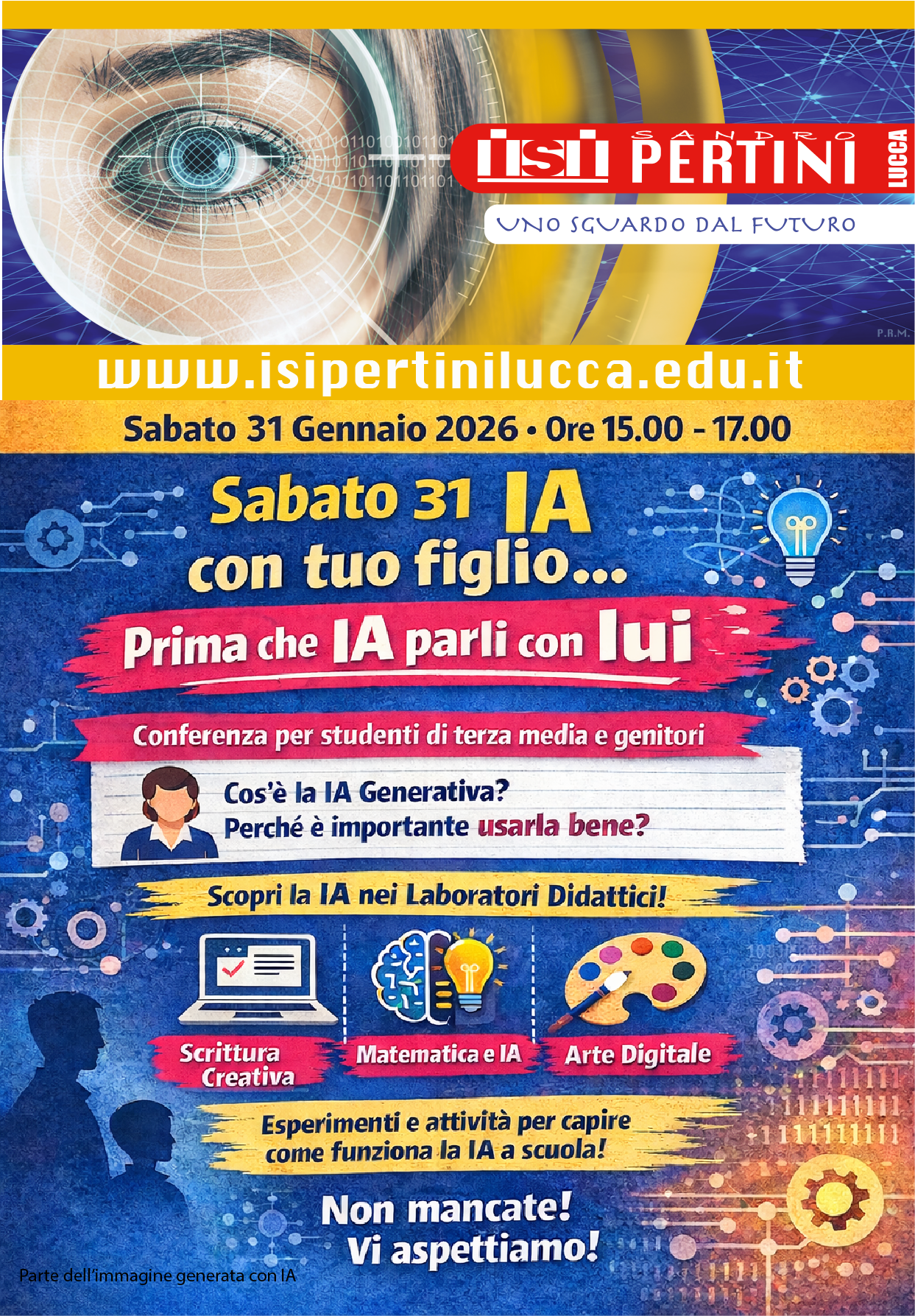 Sabato 31 gennaio dalle ore 15 alle ore 17 si svolgerà presso la sede centrale dell'ISI Pertini in Viale Cavour 267 una conferenza divulgatoria sul tema dell'uso della AI nella scuoa dal titolo "Parla di IA con tuo figlio, prima che l’IA parli con lui" Un incontro per studenti, genitori e insegnanti delle classi terze della scuola secondaria di primo grado e per le loro famiglie e famiglie degli studenti dell’ISI Pertini.