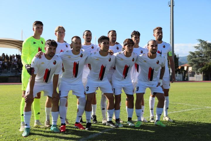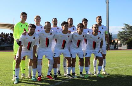 Prima vittoria in campionato contro una delle formazioni che godono dei favori del pronostico: decide un rigore di Caggianese in avvio di gara, poi i rossoneri, solidi in difesa, rischiano poco e provano a rendersi pericolosi in contropiede. Commento, tabellino e foto