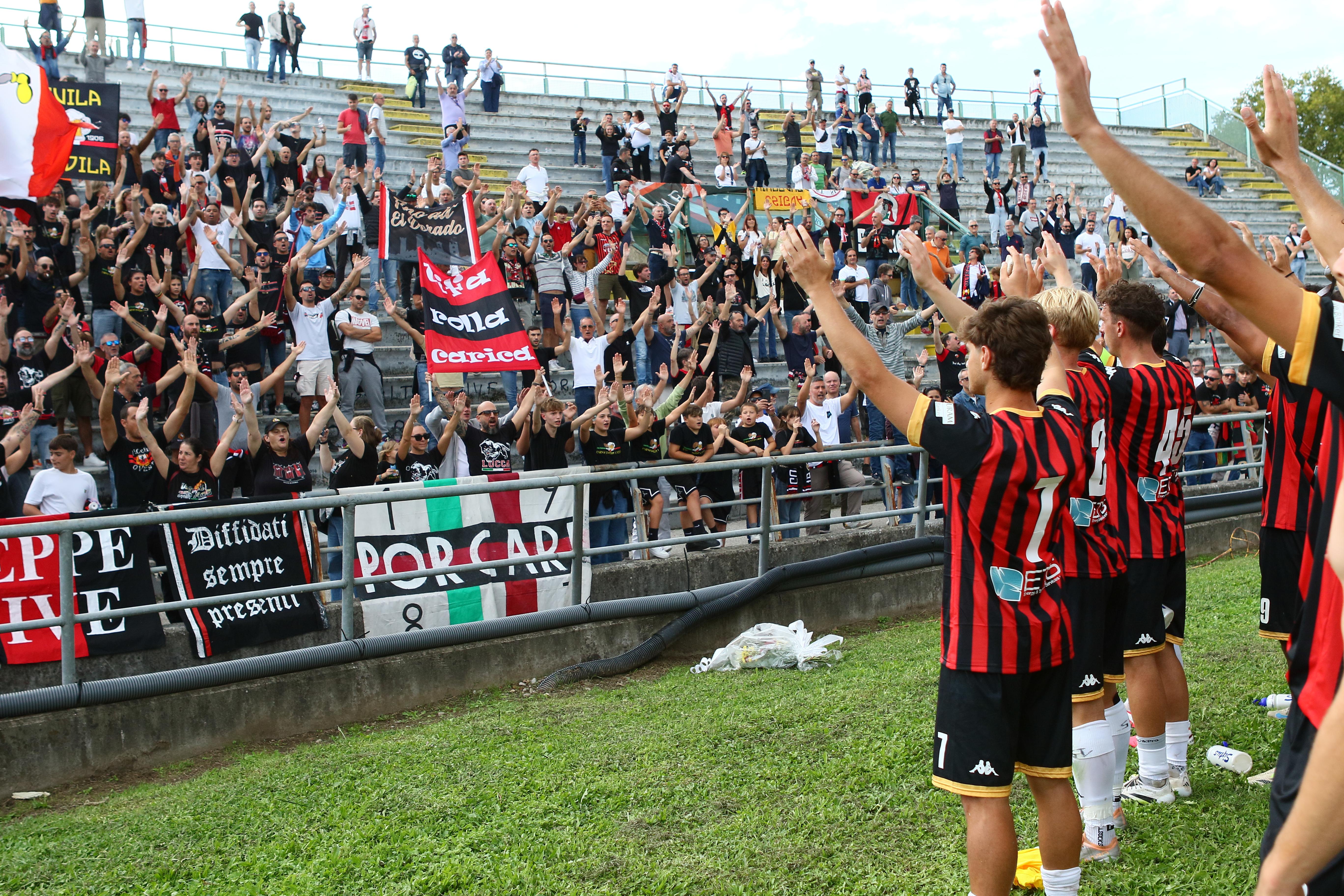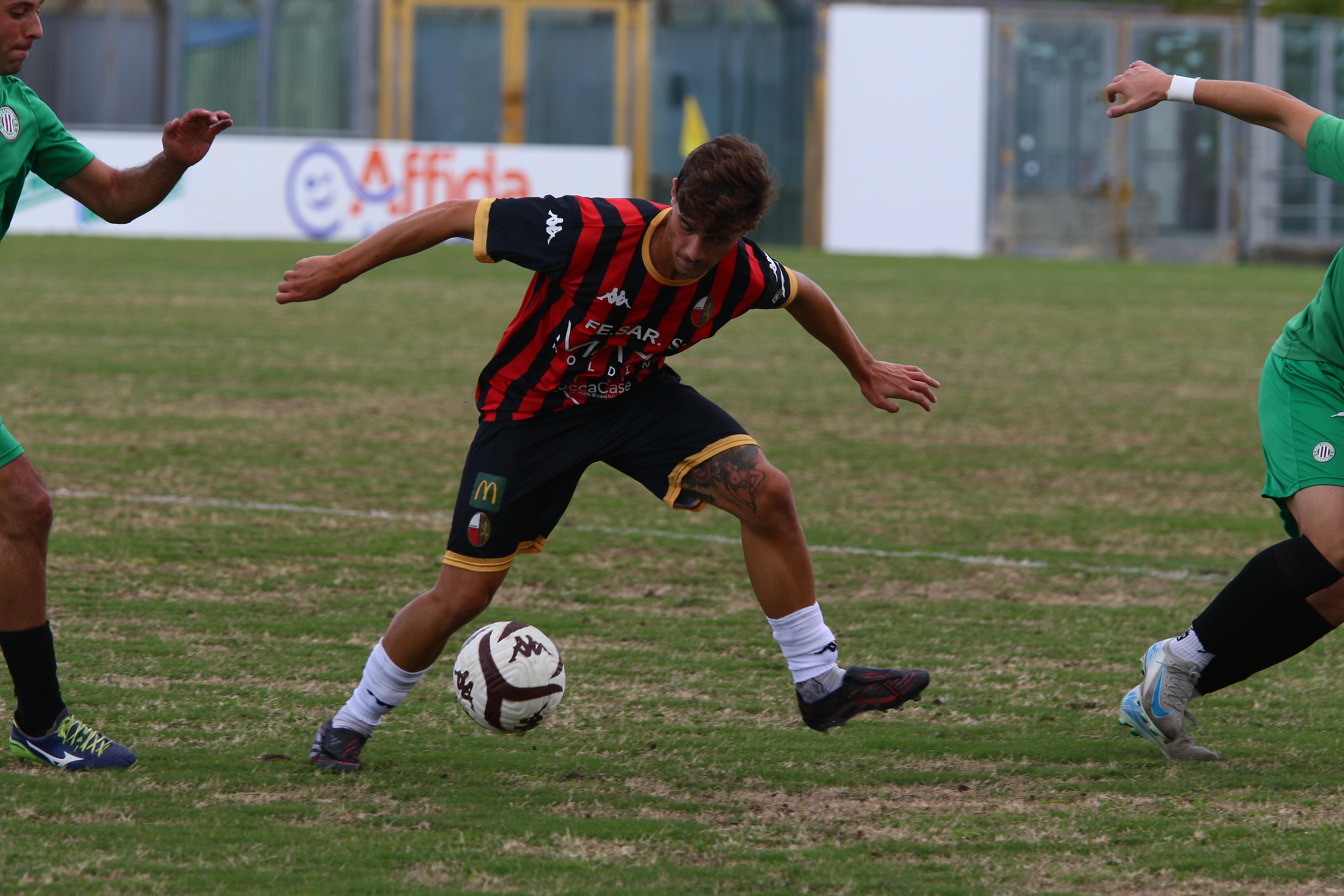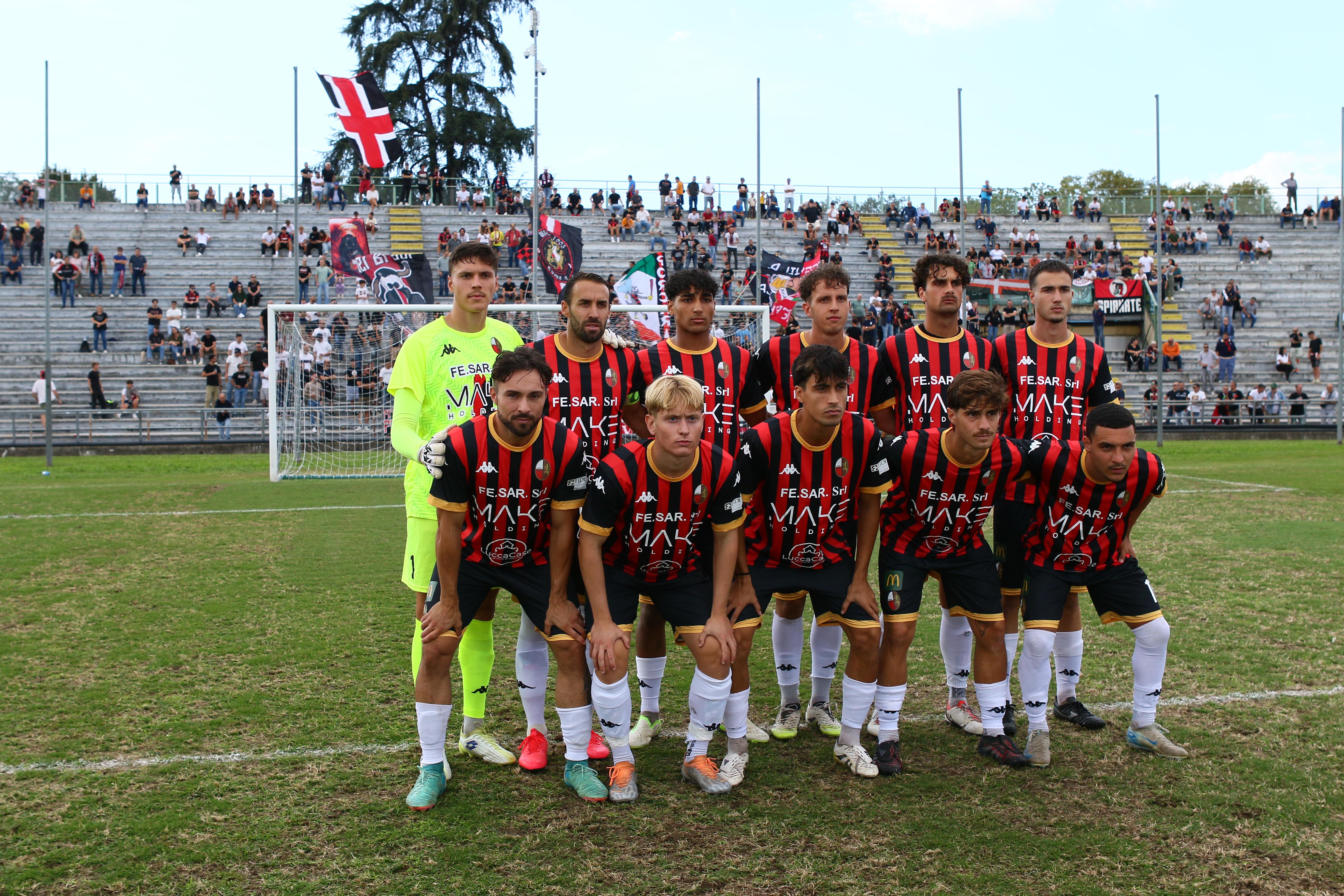 Prima vittoria in campionato contro una delle formazioni che godono dei favori del pronostico: decide un rigore di Caggianese in avvio di gara, poi i rossoneri, solidi in difesa, rischiano poco e provano a rendersi pericolosi in contropiede. Commento, tabellino e foto
