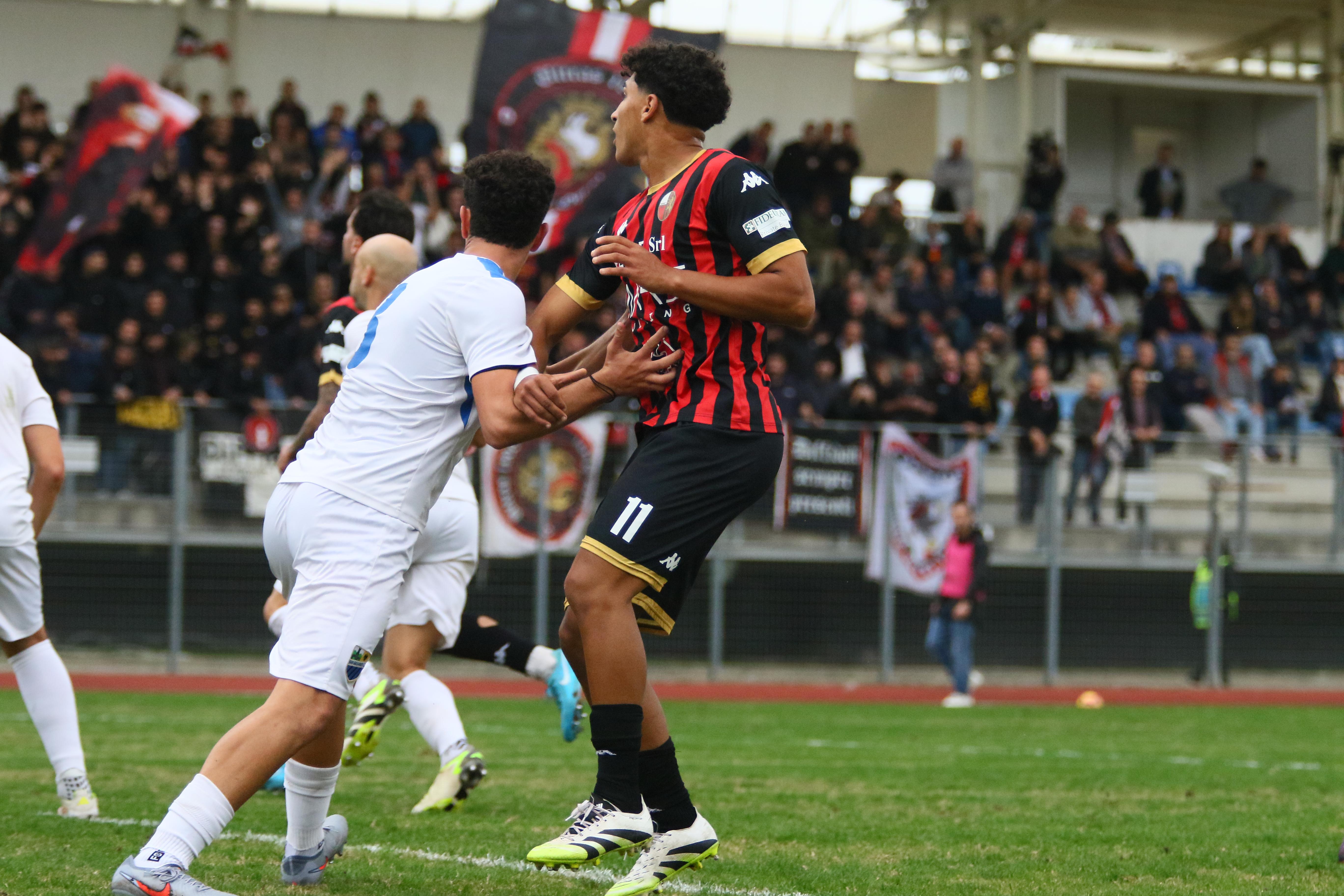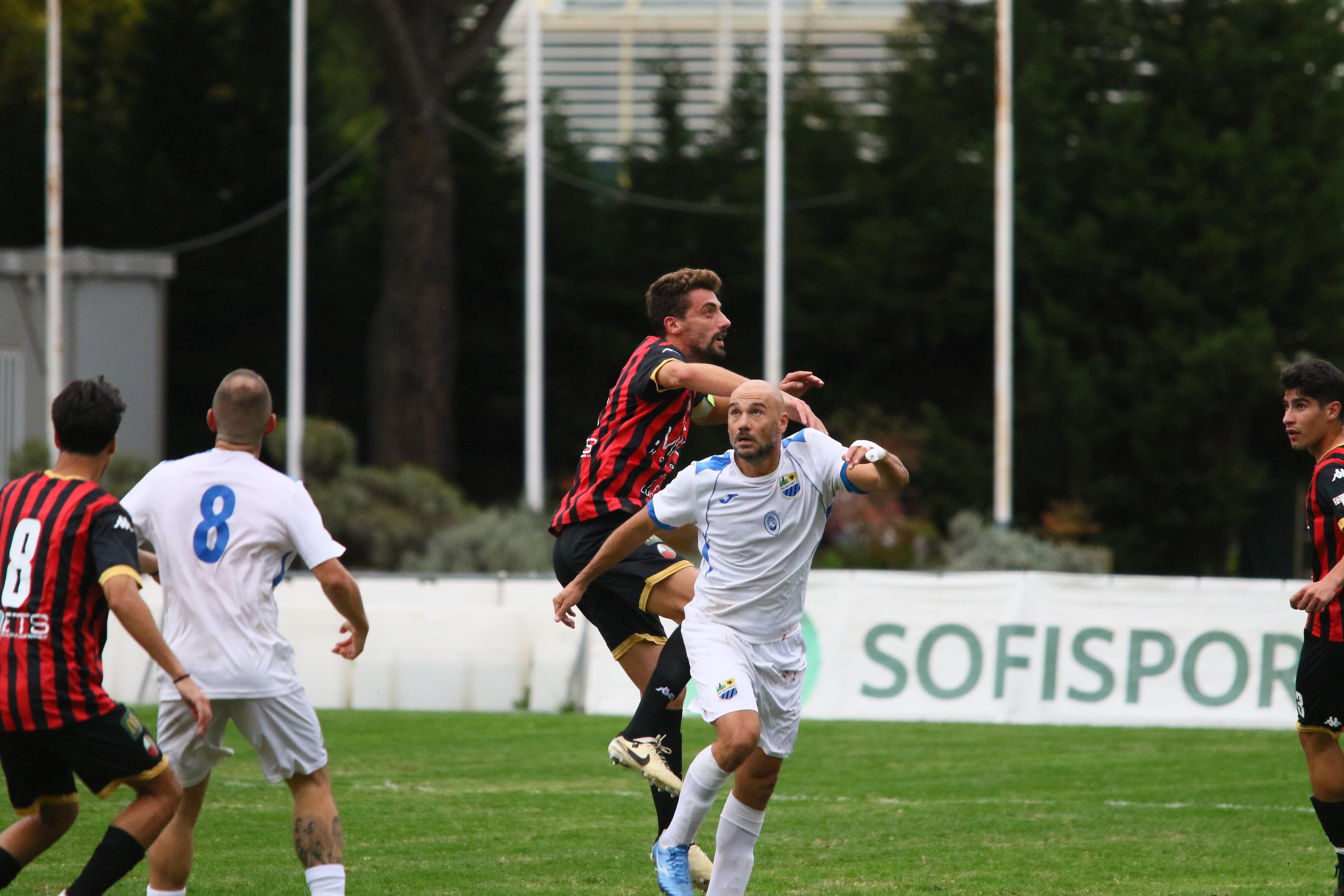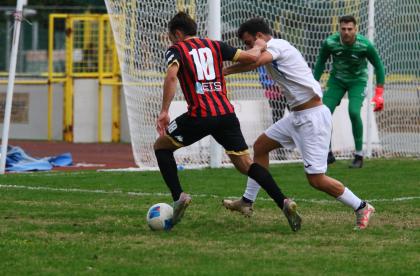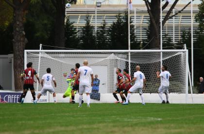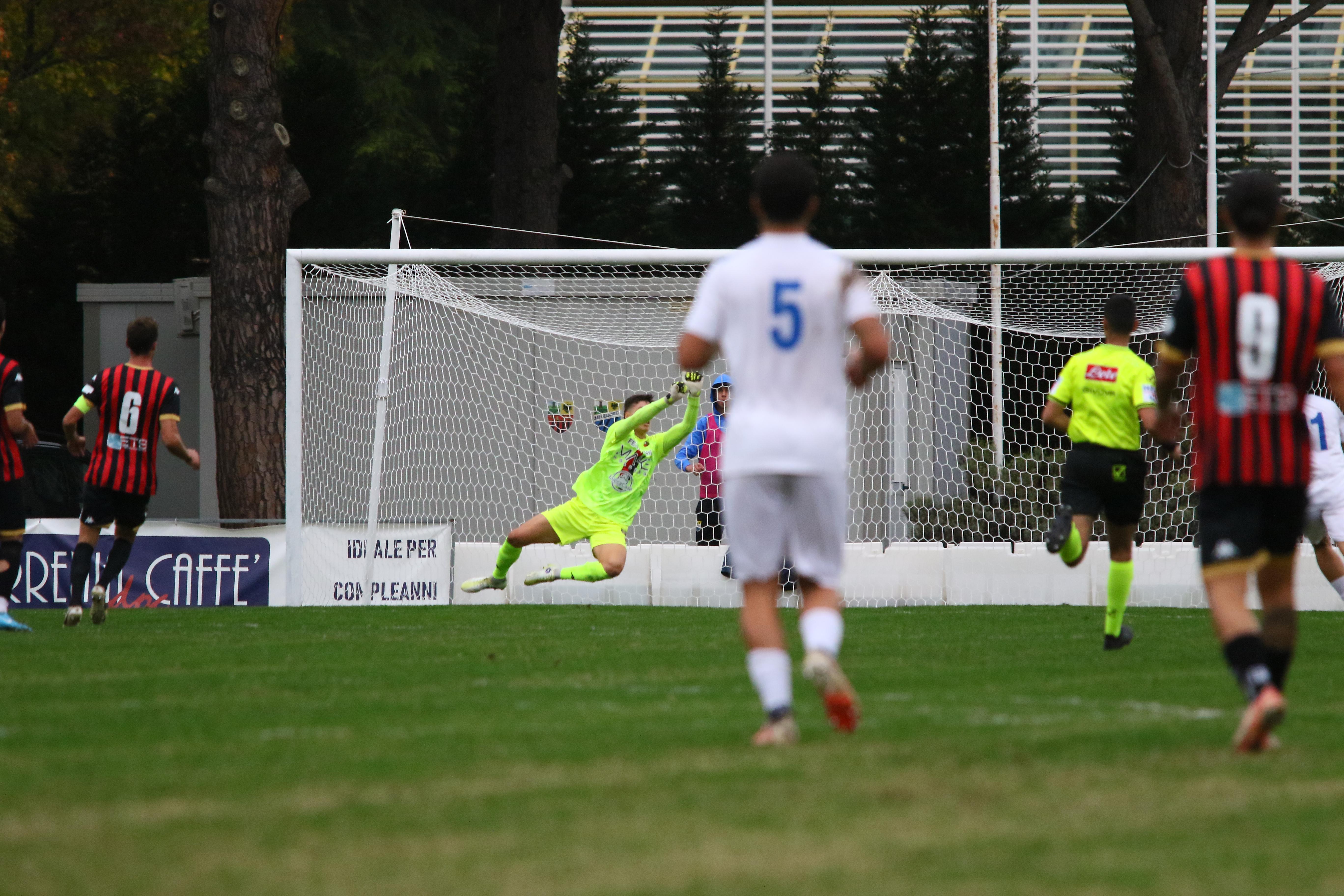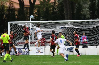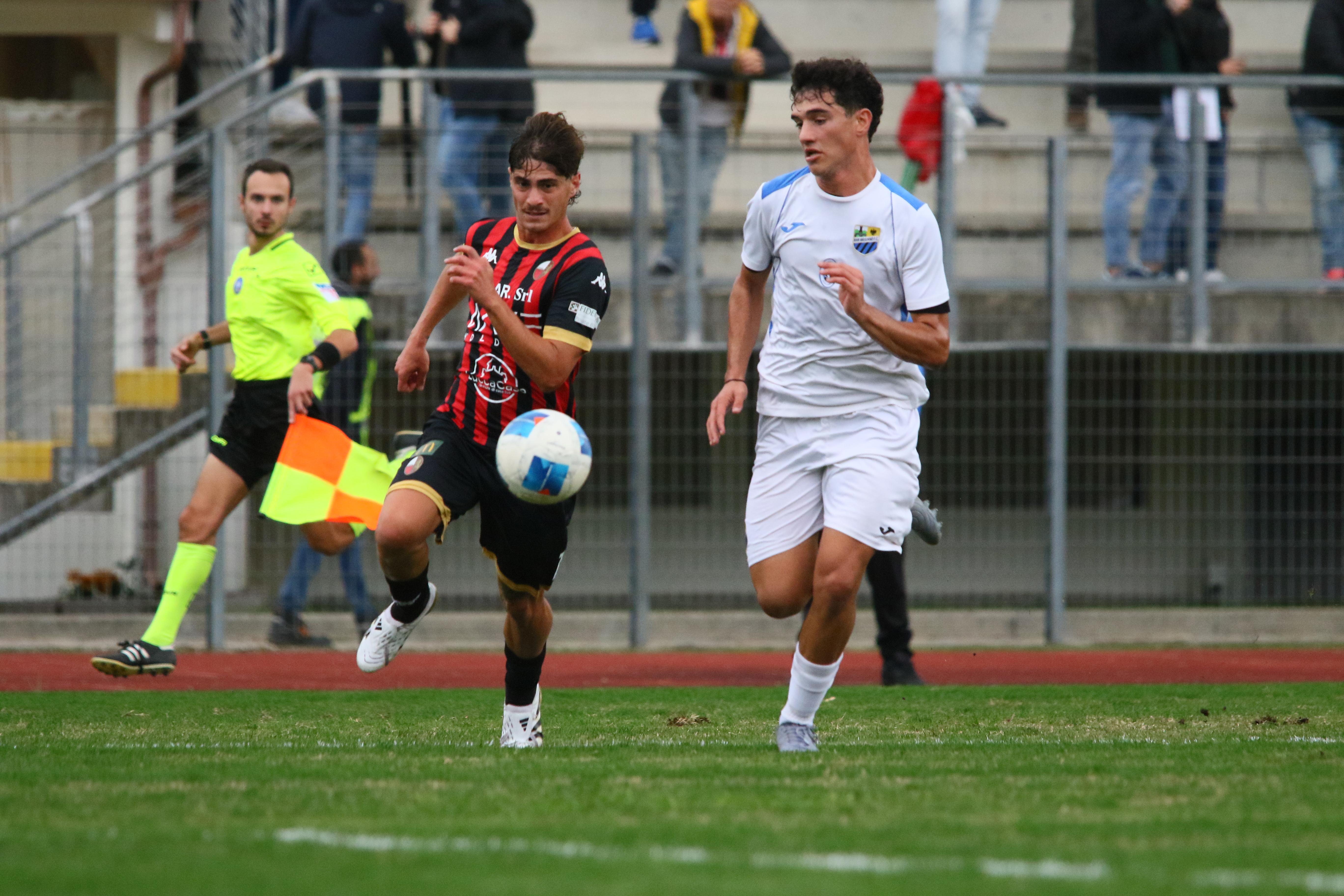 Mister Pirozzi rilancia dal primo Venanzi in difesa, mentre in attacco spazio a Piazze, Riad e Caggianese. L'avvio è senza grandi sussulti, la sensazione è che mister Cordoni abbia imbrigliato bene i rossoneri con i padroni di casa ben raccolti, molto fisici e pronti a scattare di rimessa.