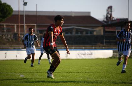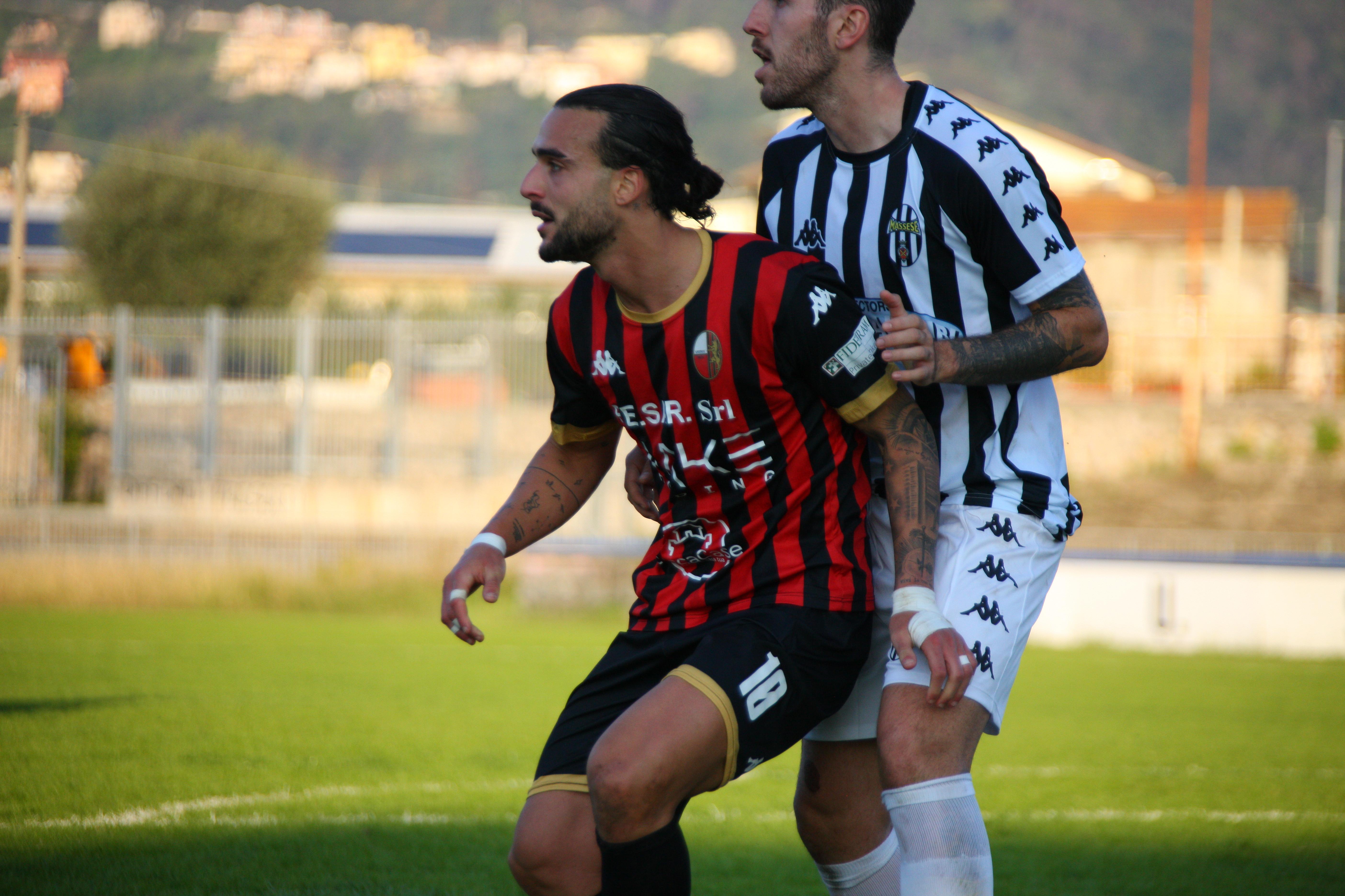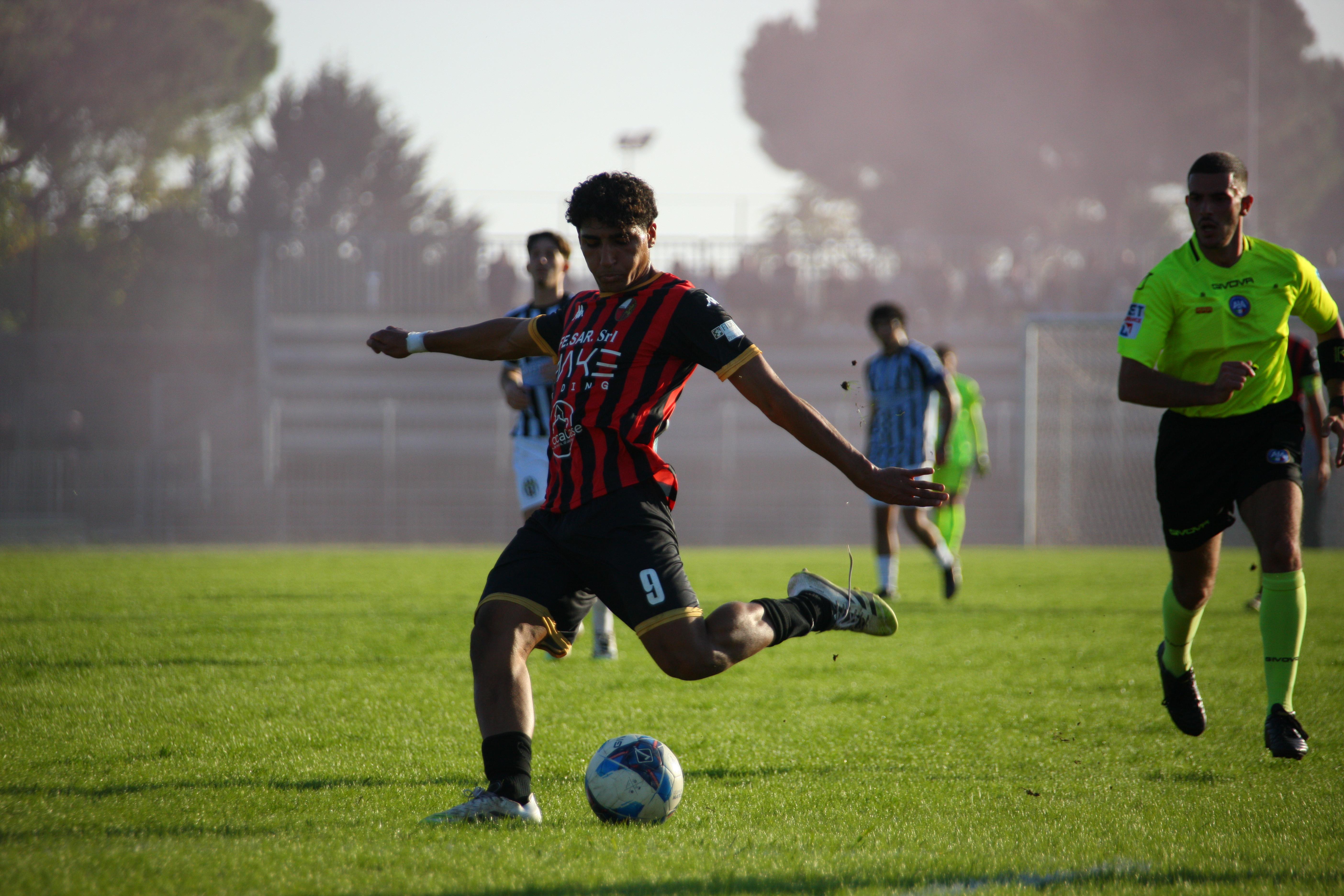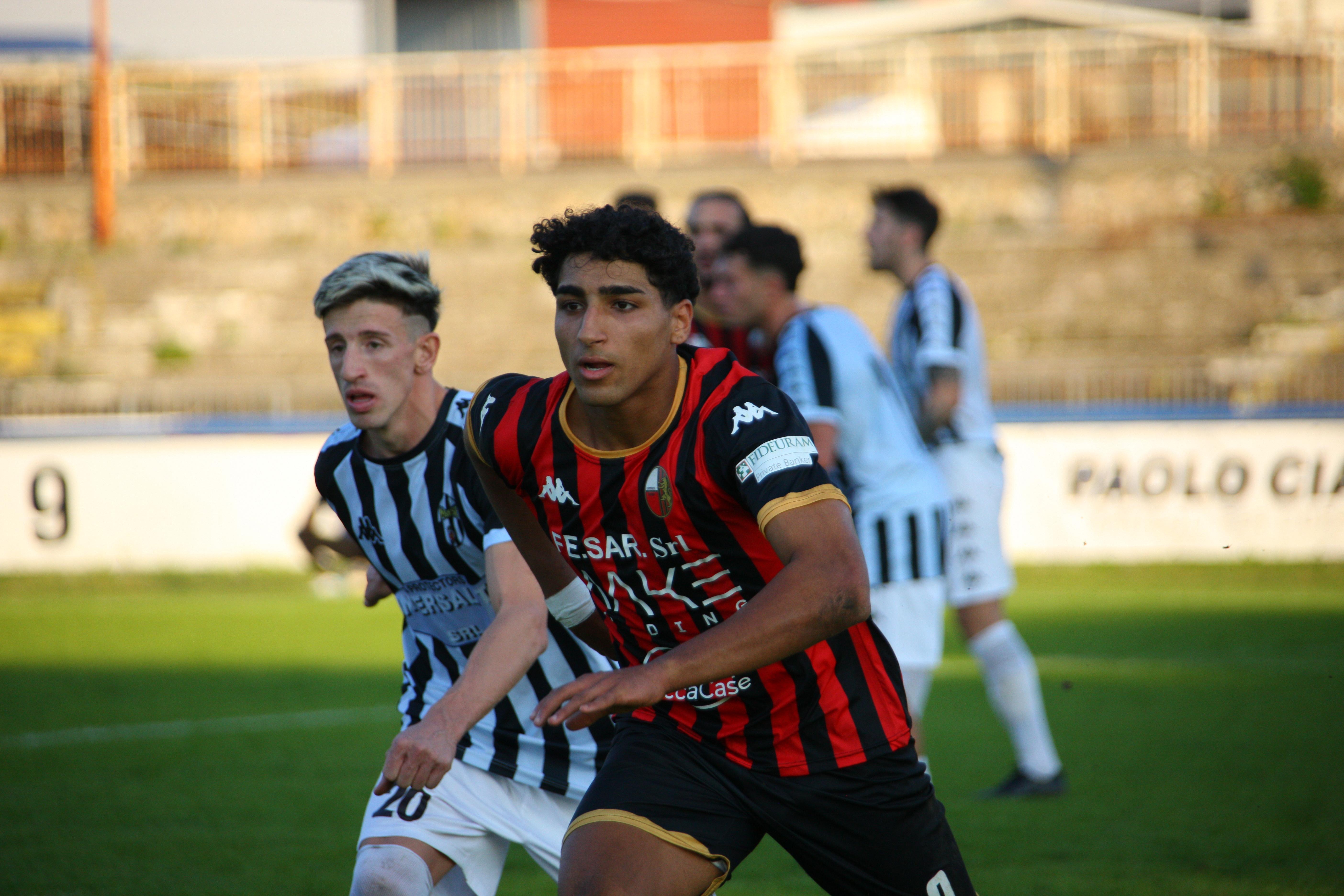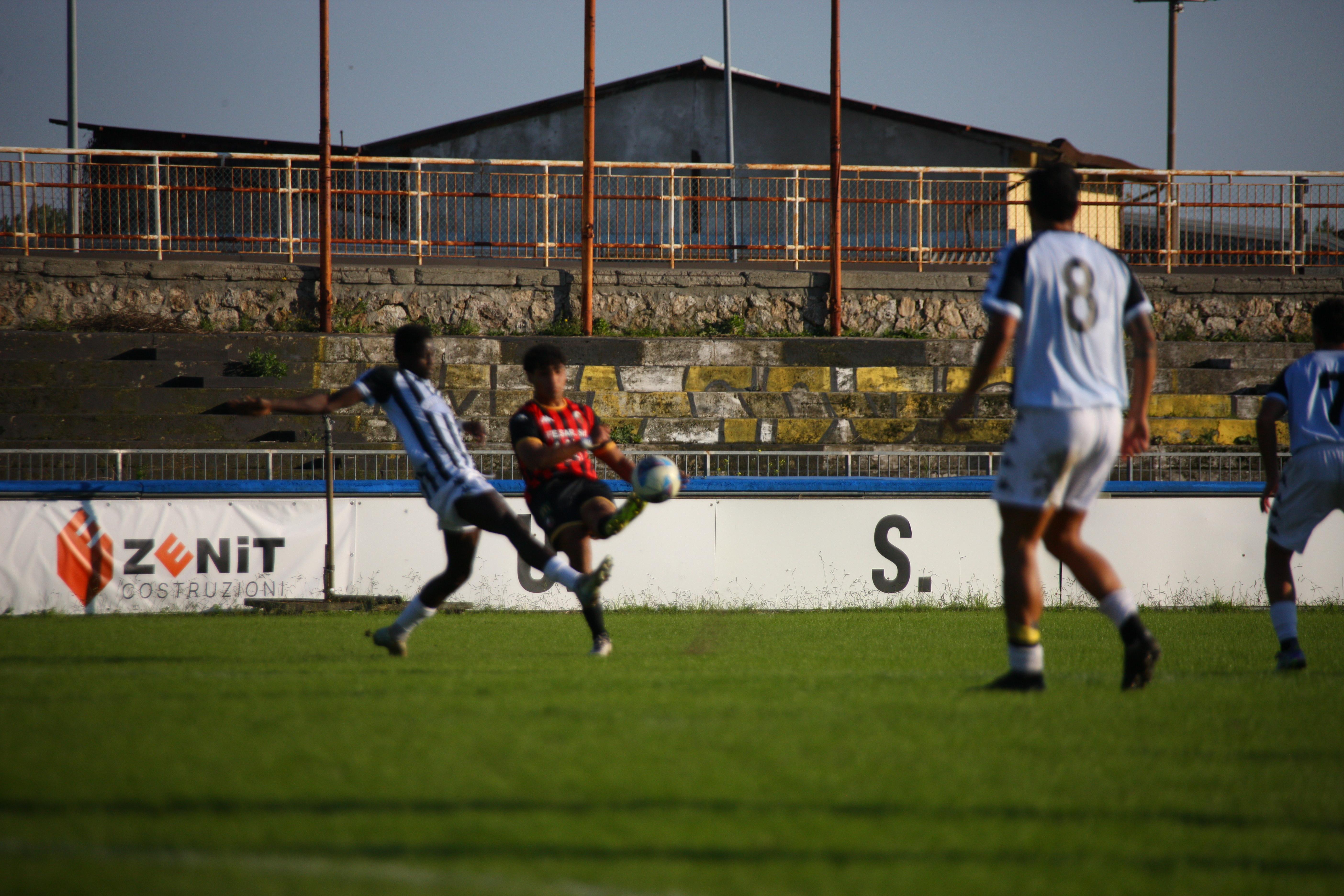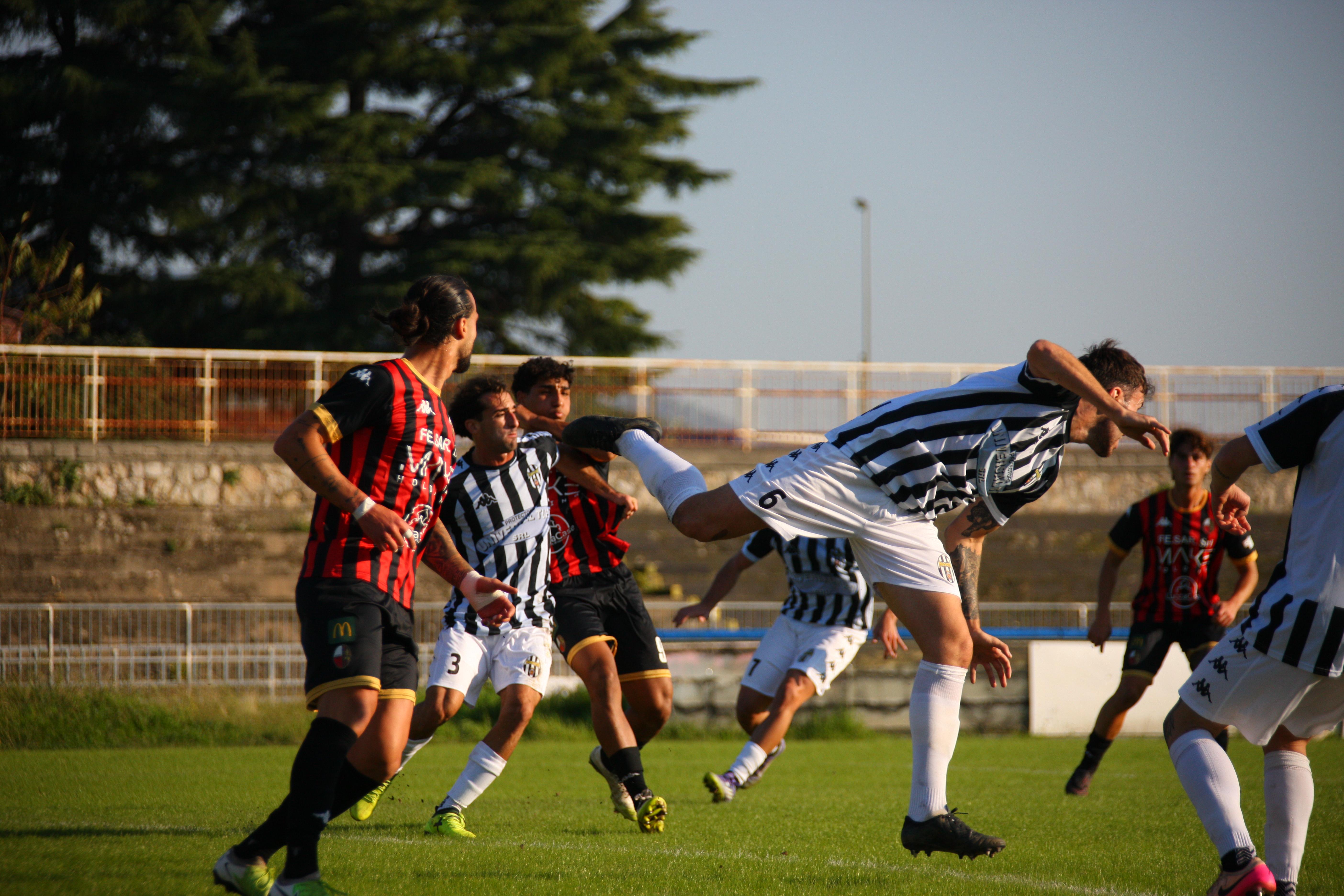 L'inizio, su un terreno solo apparentemente buono, è da ping pong, con palloni che schizzano senza un gran senso da una parte all'altra. Il primo squillo al 13': sugli sviluppi di un angolo va al tiro Picchi, la sua conclusione trova la gamba di un difensore. Cinque minuti dopo è Bartolotta a ciabattare un buon cross di Caggianese. Al 20' Piazze sul filo del fuorigioco si presenta davanti a Gatti sia pure in diagonale e si fa parare il tiro. Sugli sviluppi dell'angolo, perfetta incornata di Santeramo: è il gol del vantaggio rossonero. E' il 20'. I rossoneri insistono: al 28' Bartolotta ben servito da Riad colpisce di testa, ma la palla è alta sulla traversa. Poi è Riad a impegnare Gatti. E' un monologo, quello della squadra di mister Pirozzi. E al 44' ancora Riad chiama in causa Gatti che si supera. Per il primo tempo può bastare ed è un risultato stretto.