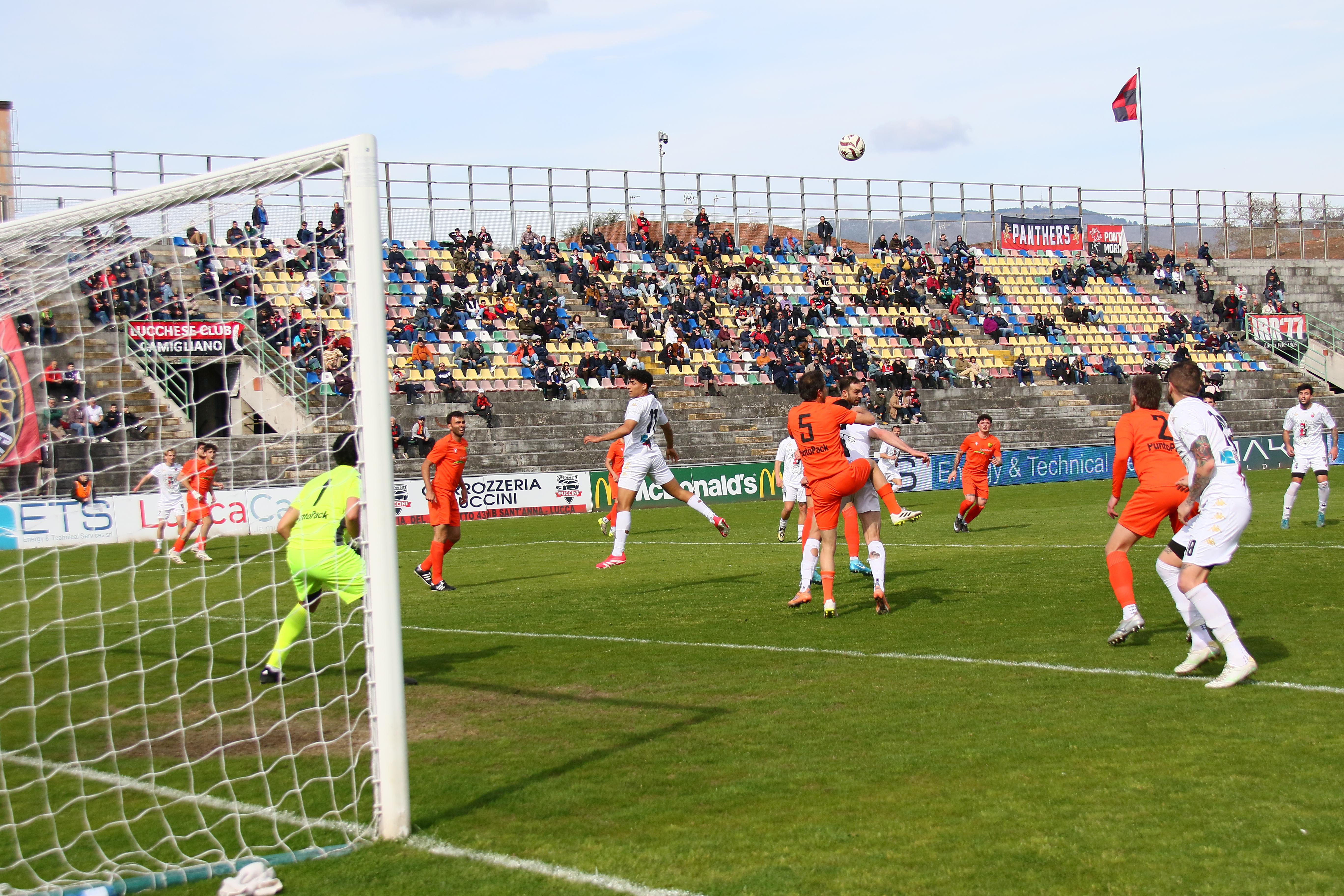 Nella ripresa, i ritmi si alzano sin dai primi minuti. Al 7' mischia furiosa in area ospite, ma la difesa riesce in qualche modo a sventare la minaccia. Tre minuti dopo Camilli, ancora una volta con una giocata da rugbista, si districa in area e lascia partire un tiro non forte ma molto preciso che si insacca alla destra di Romano. E' finalmente il gol che sblocca la gara. Pochi minuti e Riad deve lasciare il campo tenendosi la coscia: c'è da incrociare le dita. Esce anche Picchi e al loro posto, ecco Piazze e Del Rosso. Al 23' ecco la frittata, Venanzi sbaglia il rinvio e Corradi fulmina Milan. La guardalinee Giovanili segnala il fuorigioco, l'arbitro annulla, poi torna sui suoi passi e convalida. Ma la Lucchese si ributta subito orgogliosamente in avanti Camilli da un bel pallone a Piazze che fulmina Romano poco dentro l'area. Siamo al 25': il Porta Elisa esplode. Gli uomini di mister Pirozzi continuano con ferocia a attaccare: Bartolotta ha l'occasione giusta per chiudere i conti a 36', ben servito da Ragghianti da poco subentrato, ma incespica a pochi metri da Romano. Al 39' è Piazze ad avere il jolly ma spara fuori da pochi passi. La gara è senza soste con gli ospiti che provano a far il bis su un paio di calci piazzati. A una manciata di secondi dal termine è Ragghianti a cercare il tris con una bella conclusione, ma il portiere ospite vola ed evita il gol. E' finita: la Lucchese inizia davvero a fare il conto alla rovescia. Quattro gare, forse meno, per lasciare l'Eccellenza.