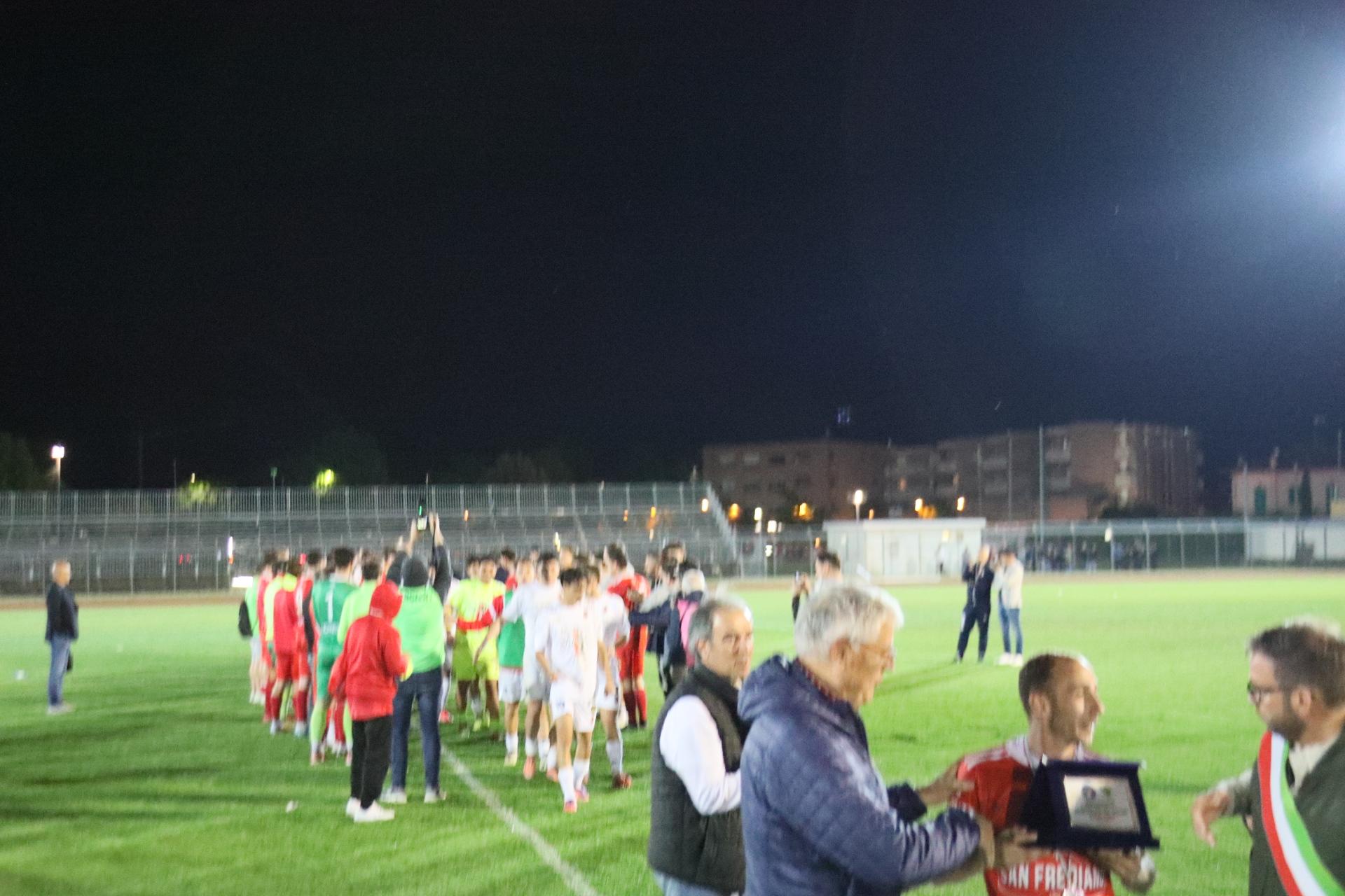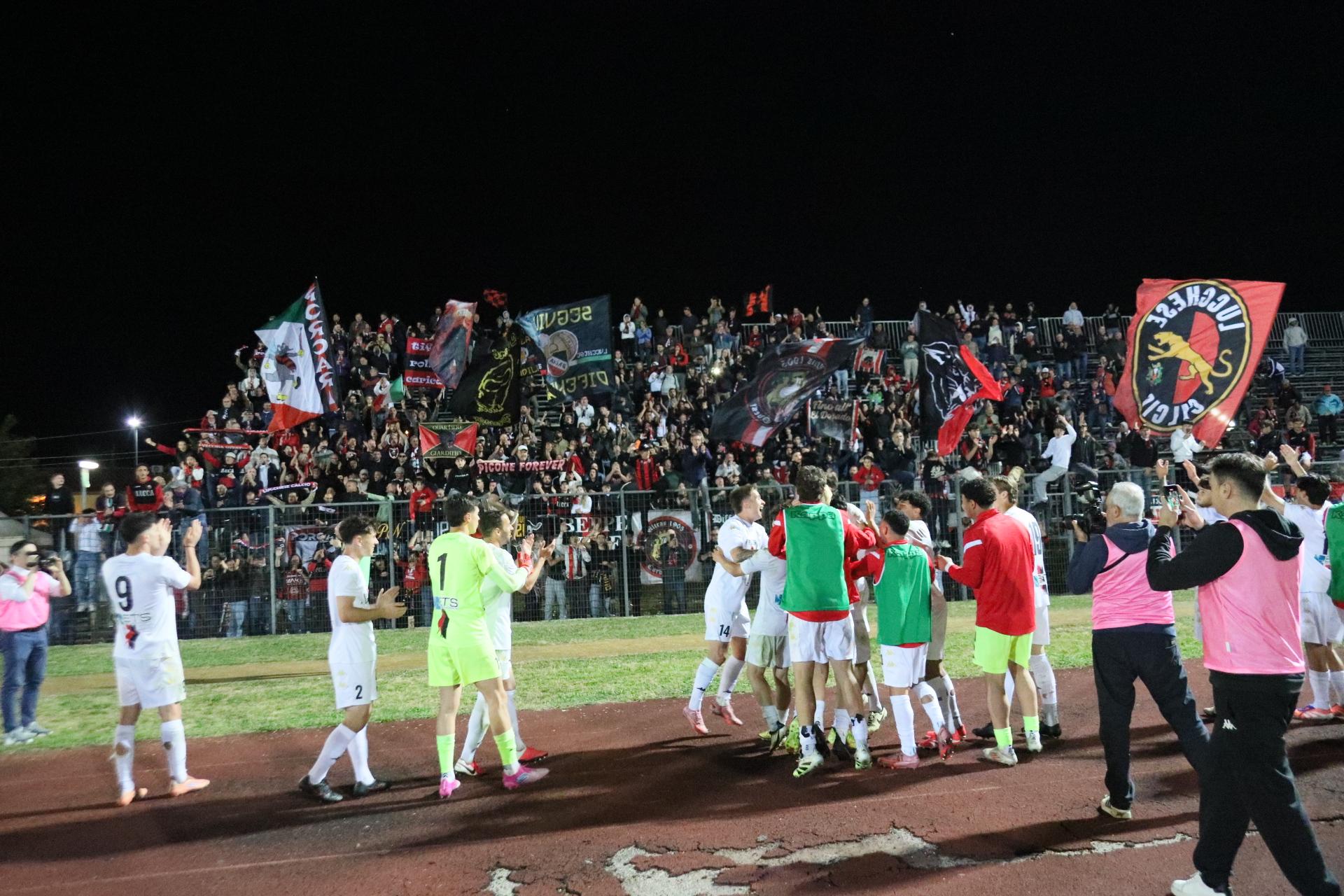 La Lucchese chiude il campionato con una netta vittoria contro il Fucecchio: Camilli e Rotondo nel primo tempo e Riad nella ripresa sigillano l'incontro. Grande festa ai rossoneri da parte del pubblico: commento, tabellino e foto