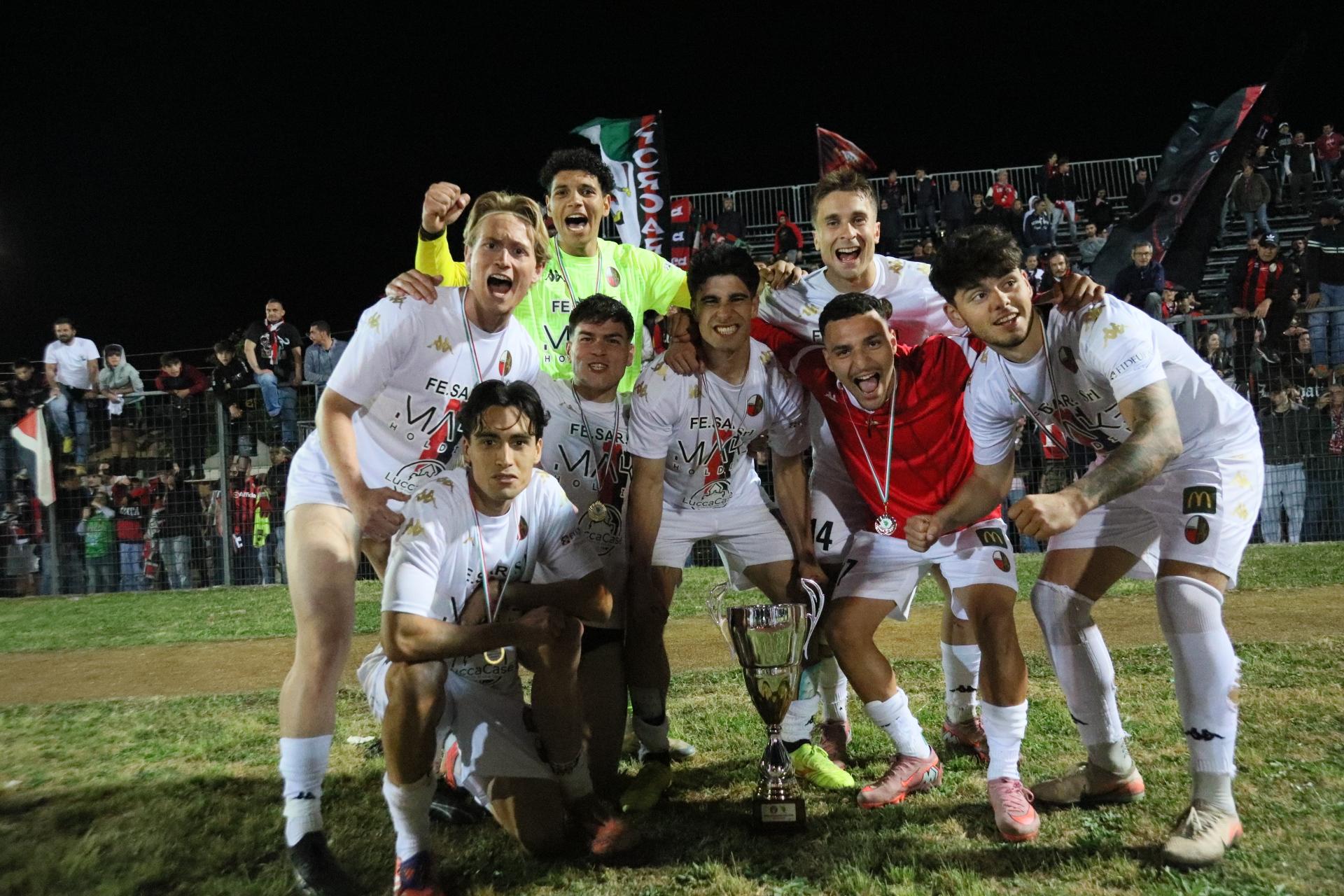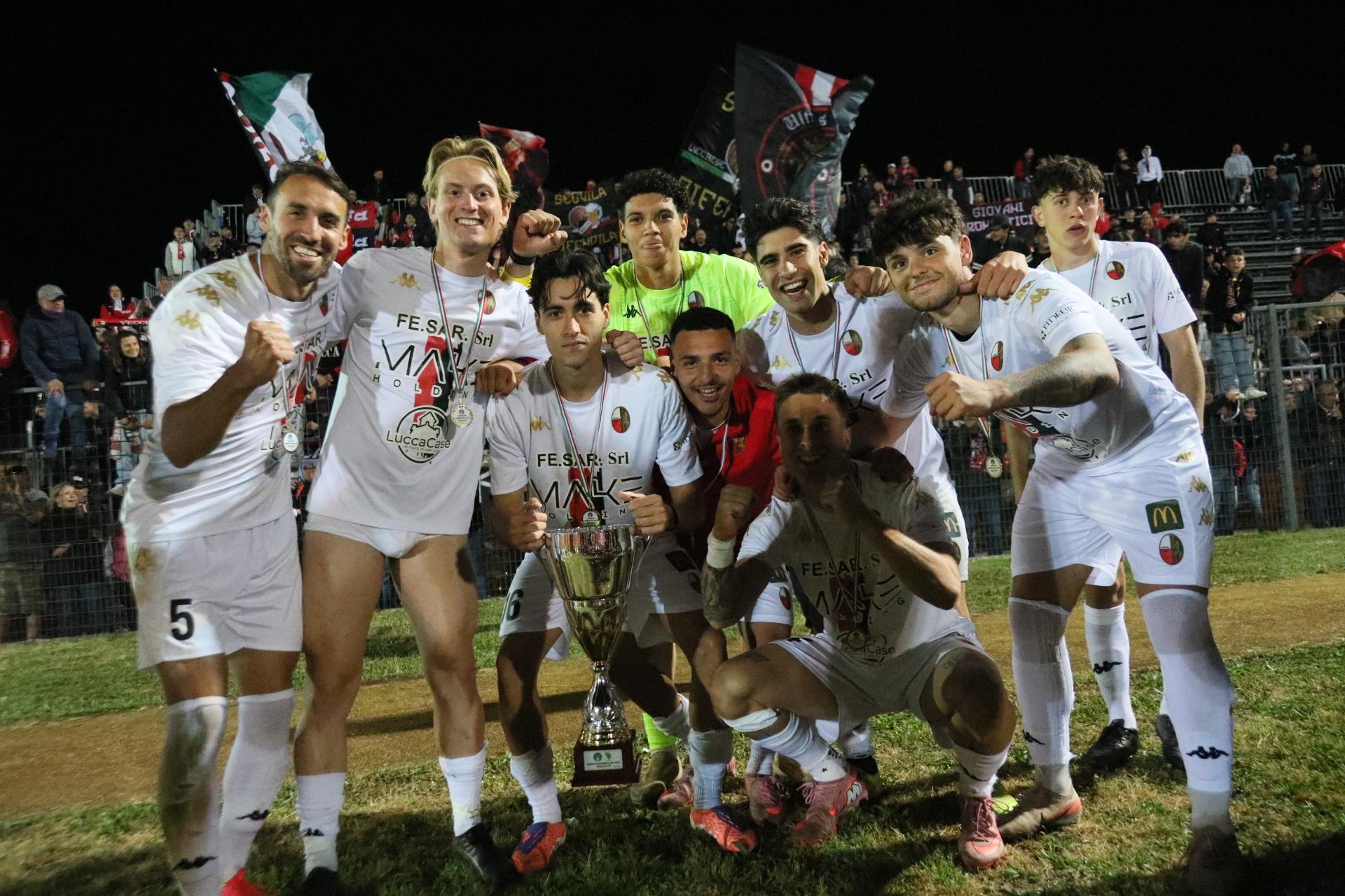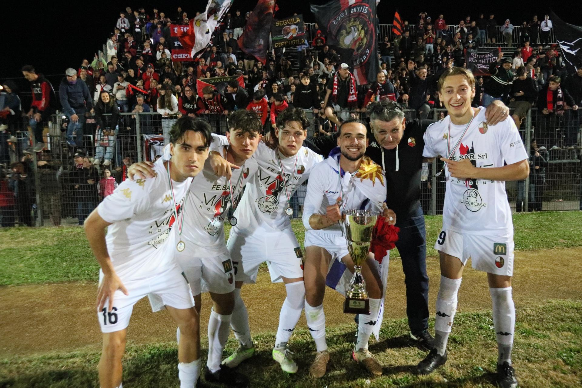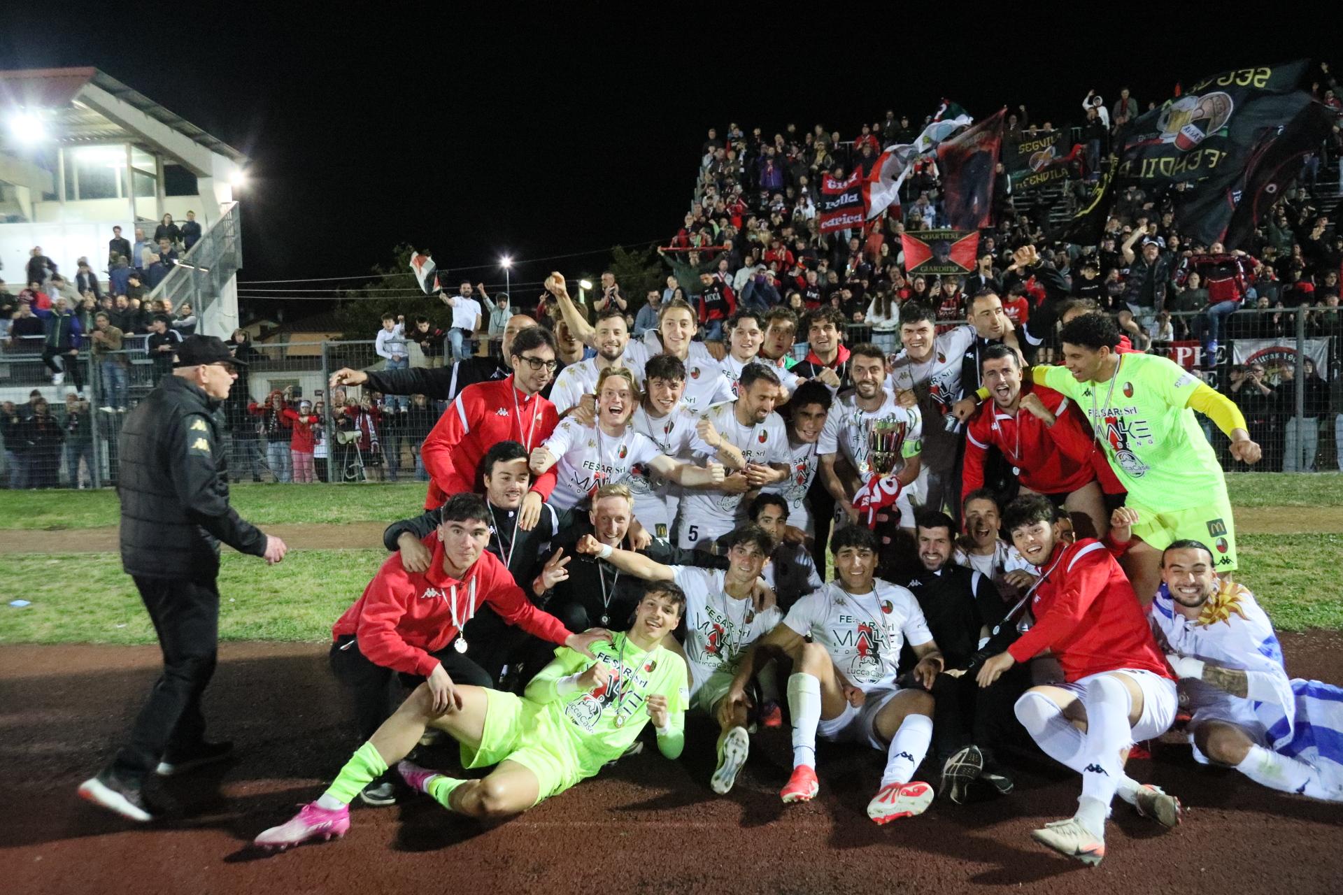 La Lucchese vince 2-0 contro il Perignano e centra la promozione in Serie D con due giornate di anticipo. Sblocca nel primo tempo Fedato su rigore, nella ripresa, Lorenzini mette il risultato al sicuro. Porta Elisa con 3500 spettatori: commento, tabellino e foto
