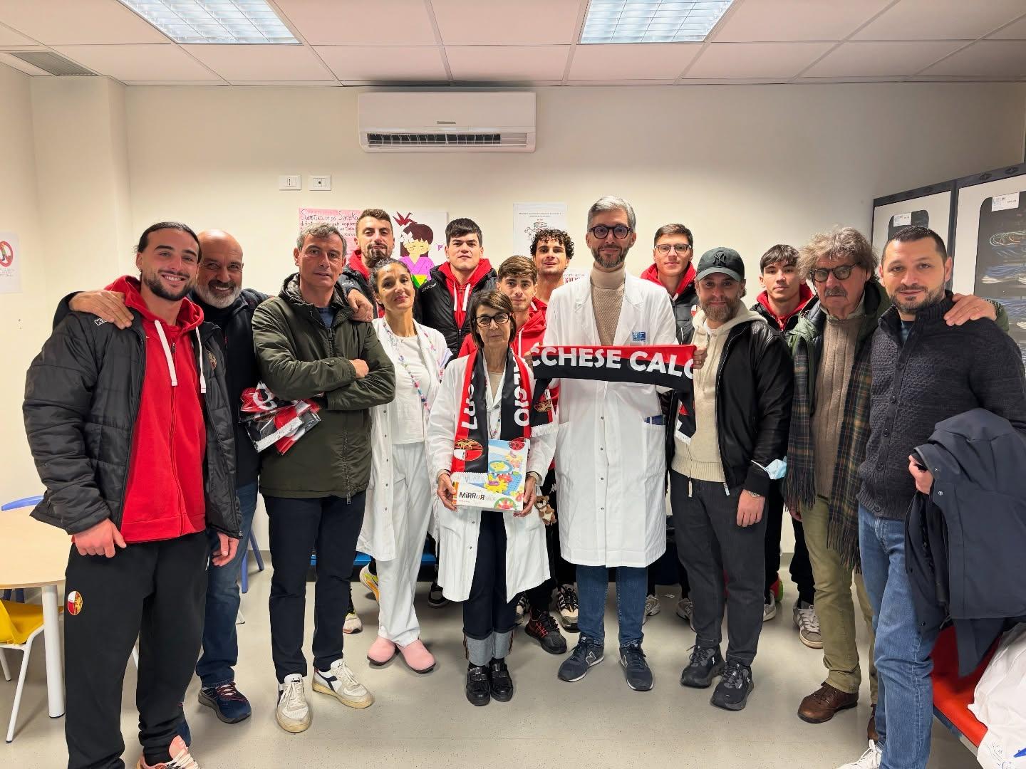 Nella delegazione che si è recata in Pediatria, oltre ad alcuni giocatori, il patron Brunori, il tecnico Pirozzi, il direttore Gianni e il responsabile del settore giovanile Morgia. "Un gesto semplice – si legge sul profilo Facebook della società – ma dal grande valore, per scaldare il Natale e ricordare che il calcio è anche vicinanza, condivisione e cuore".